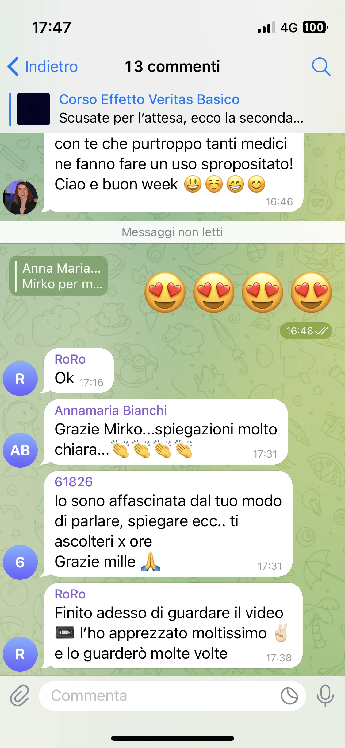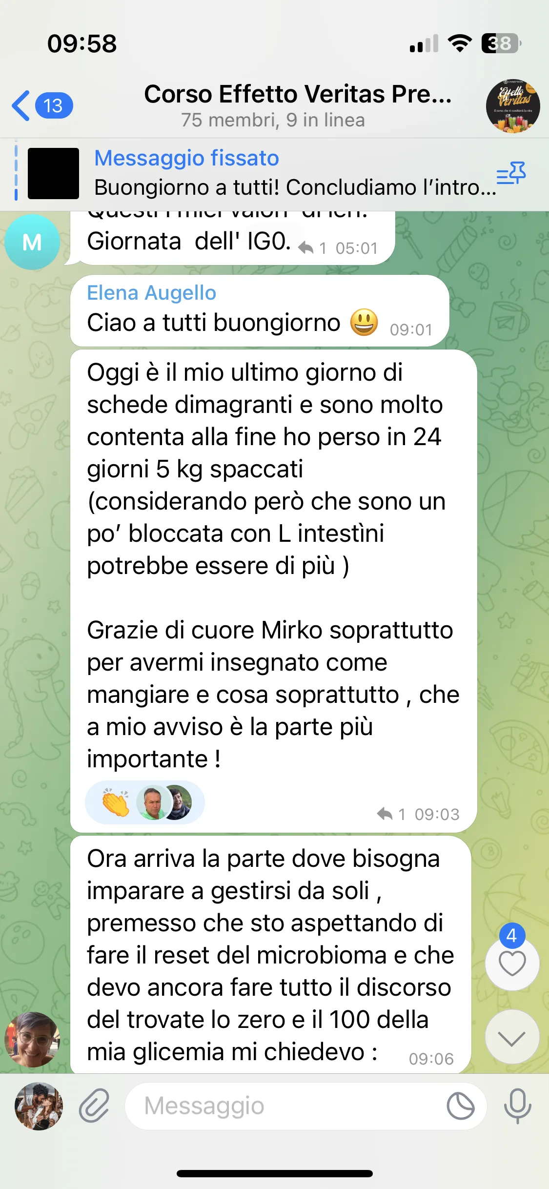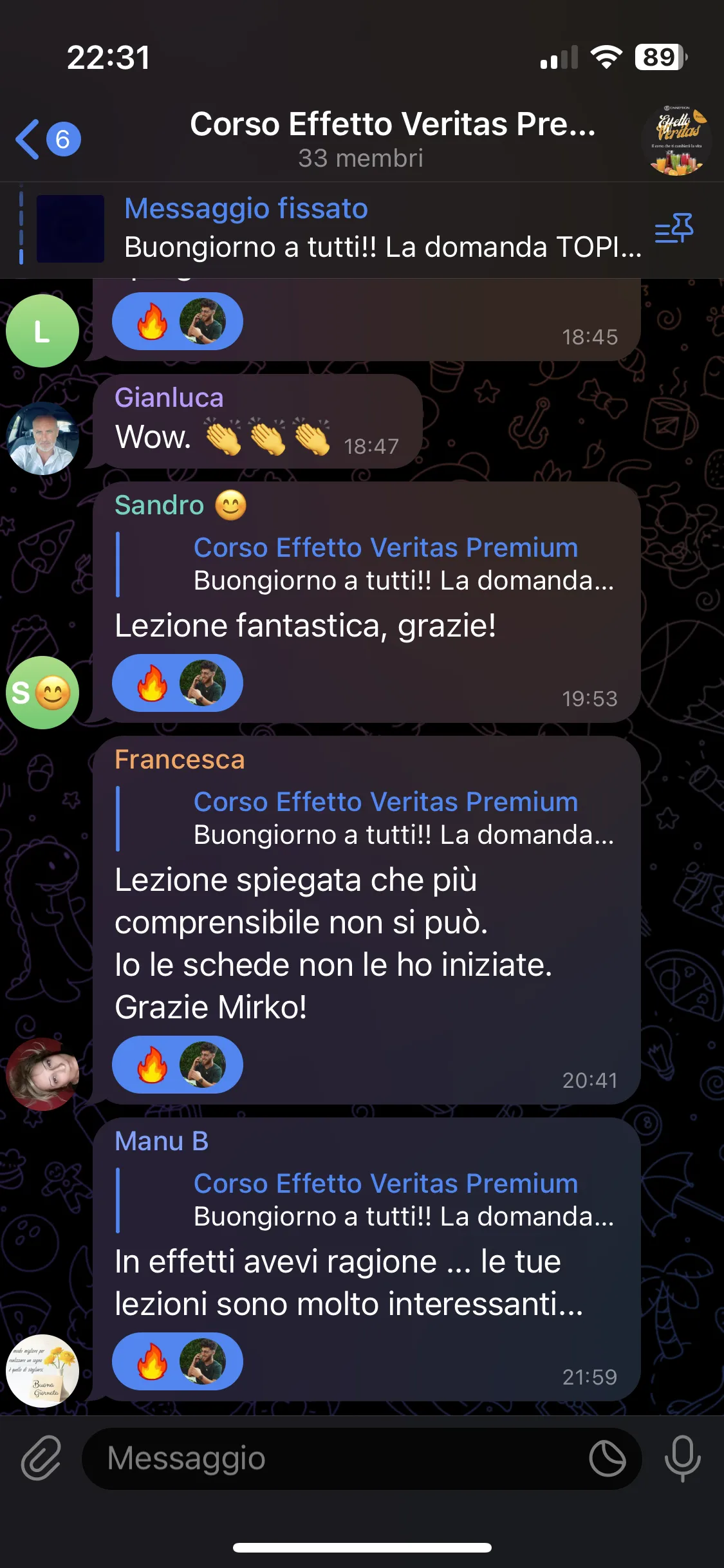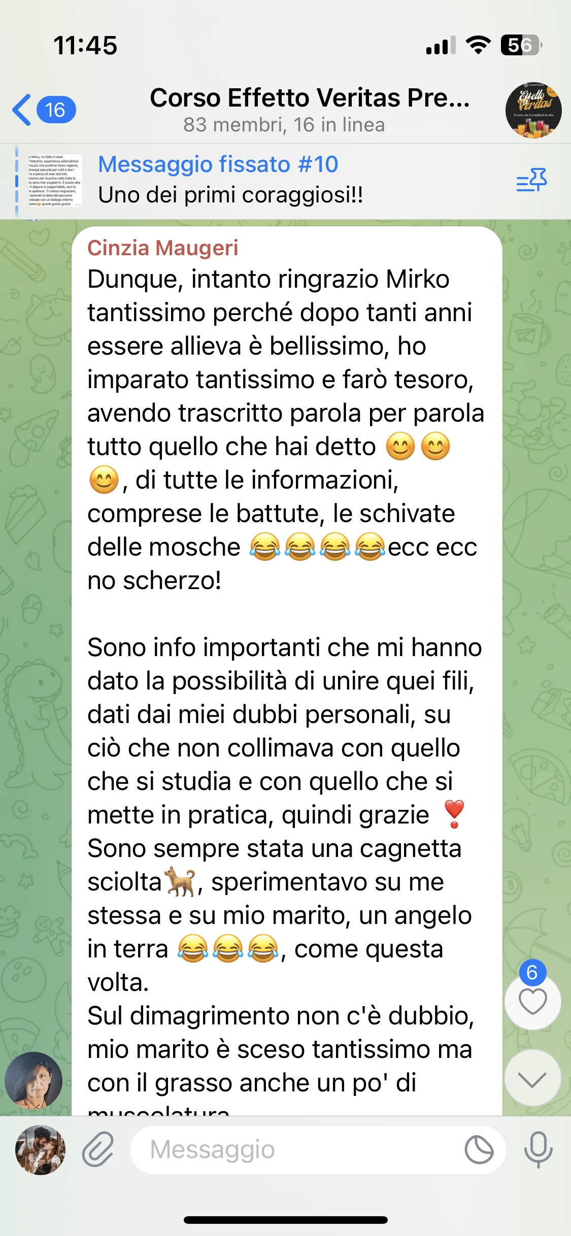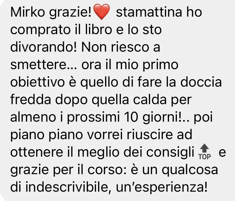 Avevo già seguito i corsi di Mirko, avevo aspettative molto alte e sono state pienamente soddisfatte. Mi porto a casa tanta consapevolezza e strumenti concreti su cui lavorare. Lo consiglio a chiunque abbia un problema fisico o psicologico, perché qui può davvero trovare un aiuto per uscirne.