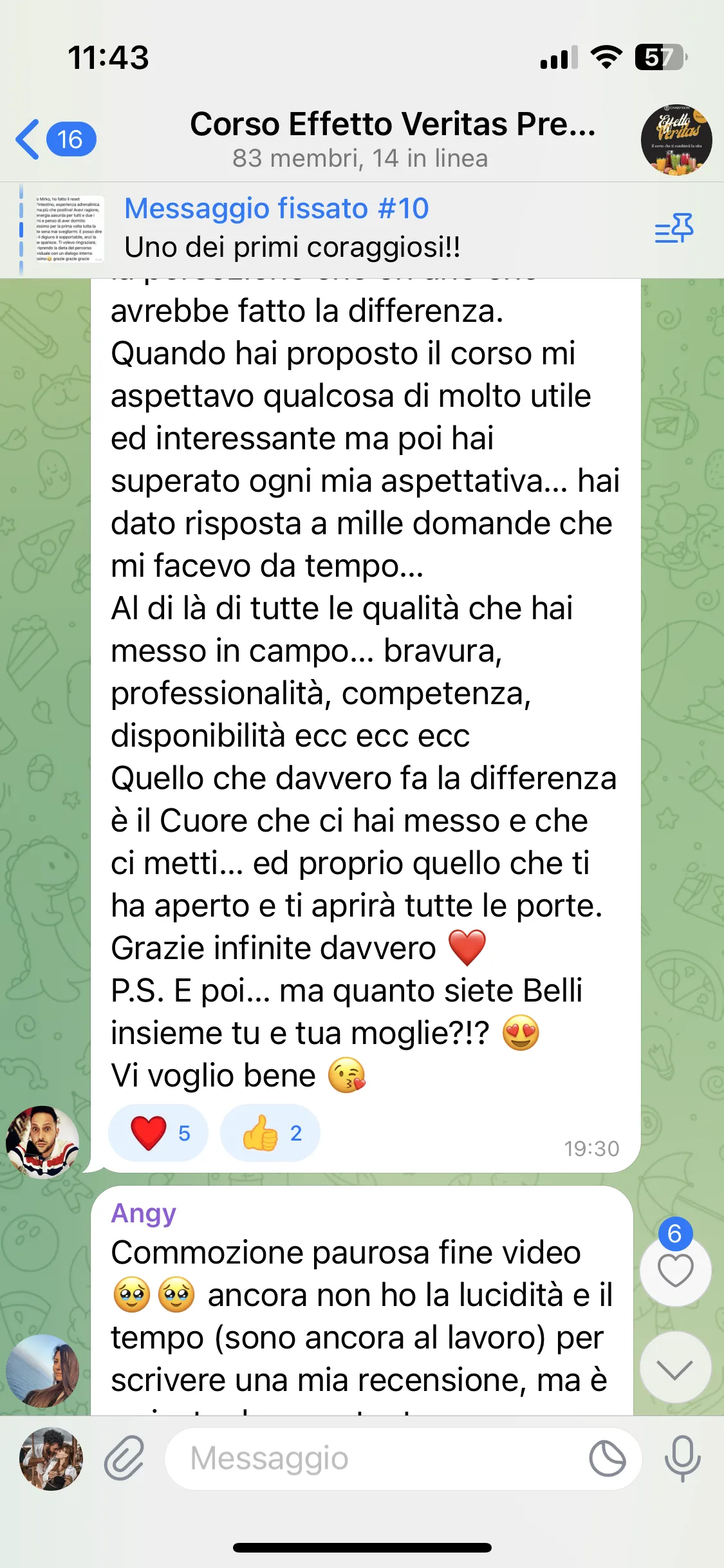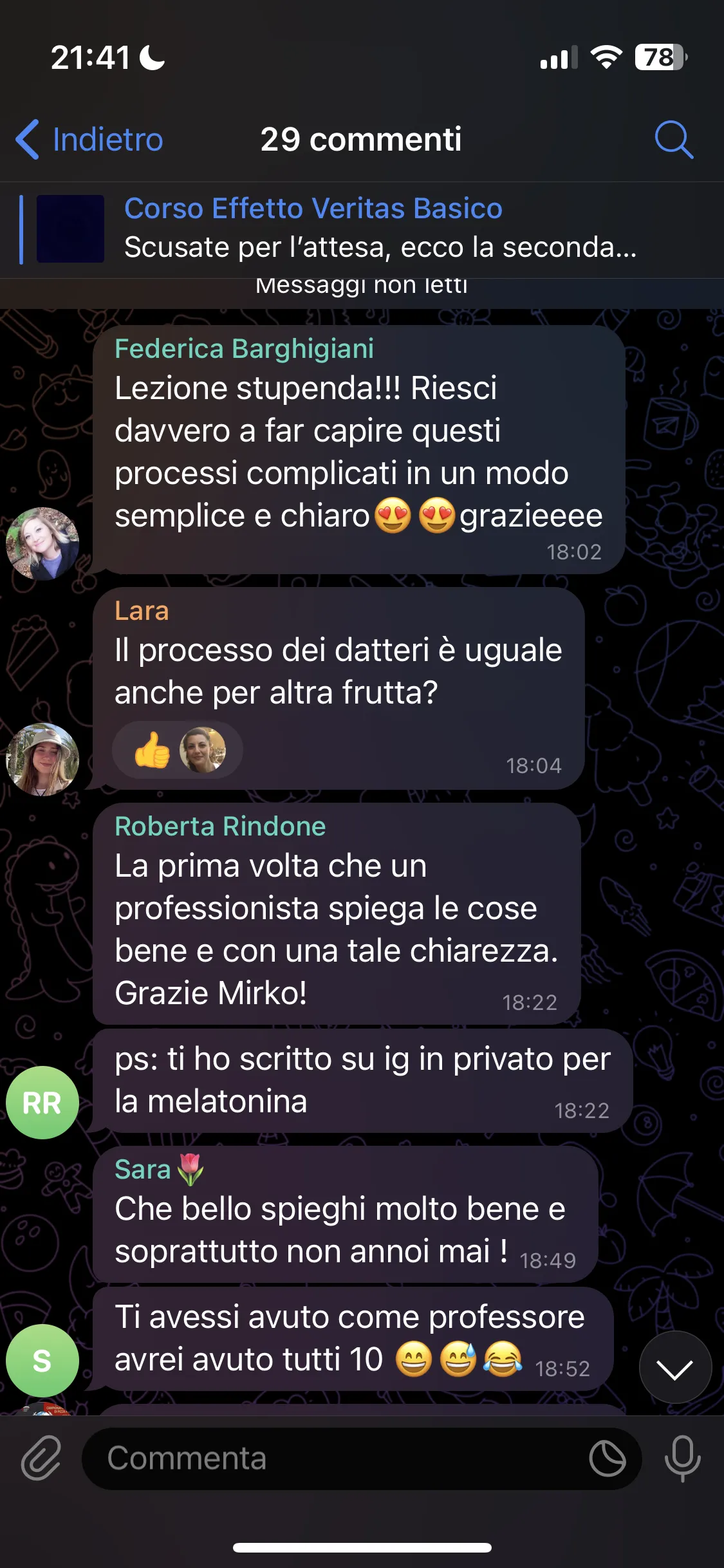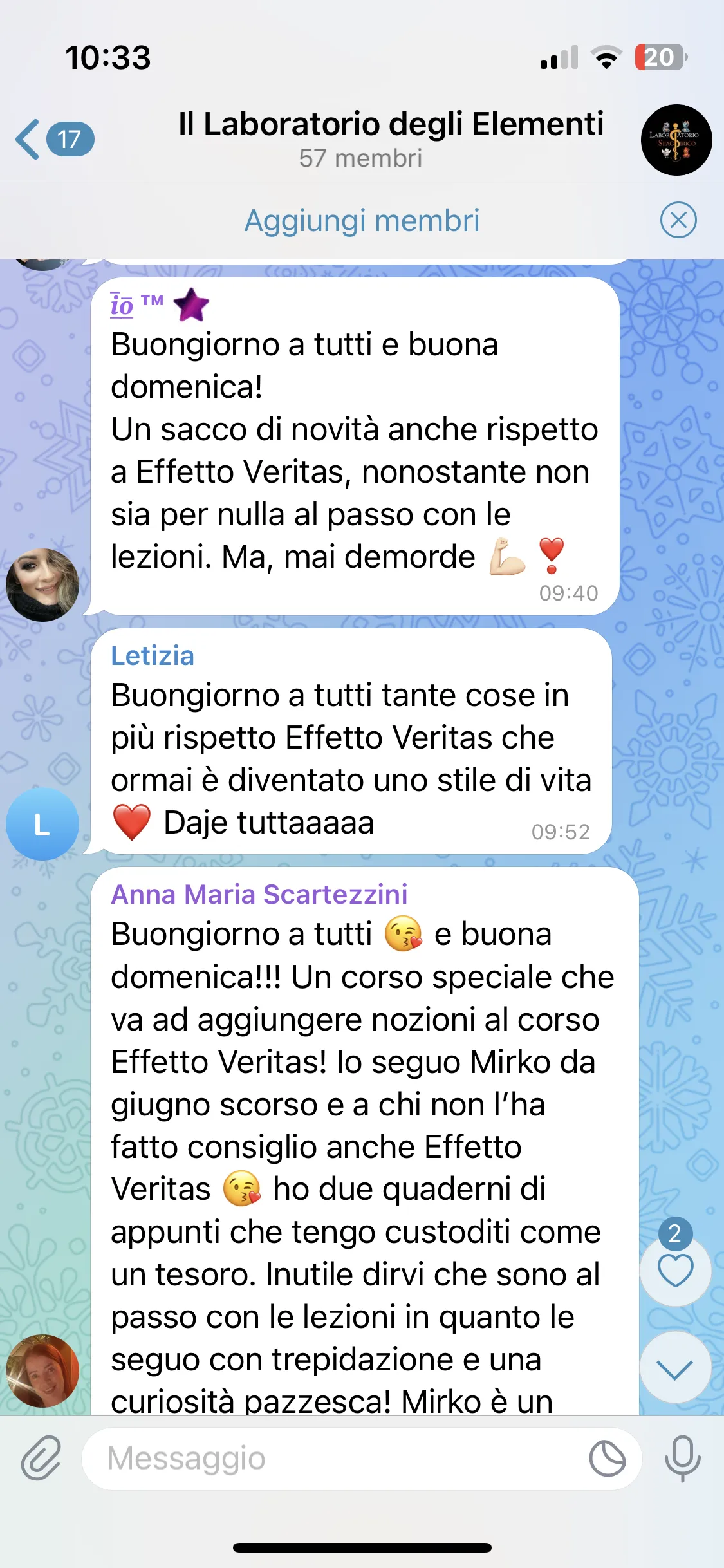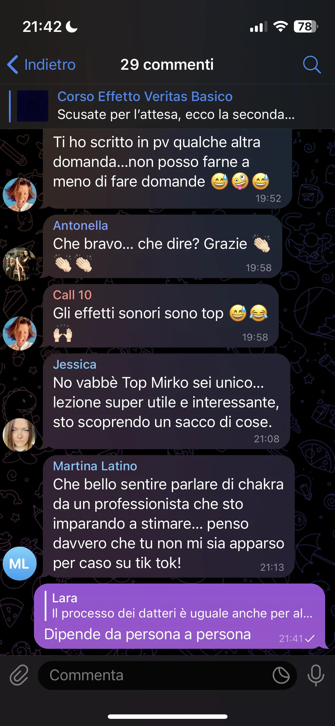 "Conosco Mirko da più di 2 anni e ho seguito i suoi corsi, ogni volta riesce a darmi qualcosa in più. Parteciperò ancora, perché ogni evento mi aiuta a vedere le cose in modo diverso. È un percorso che consiglio a tutti."