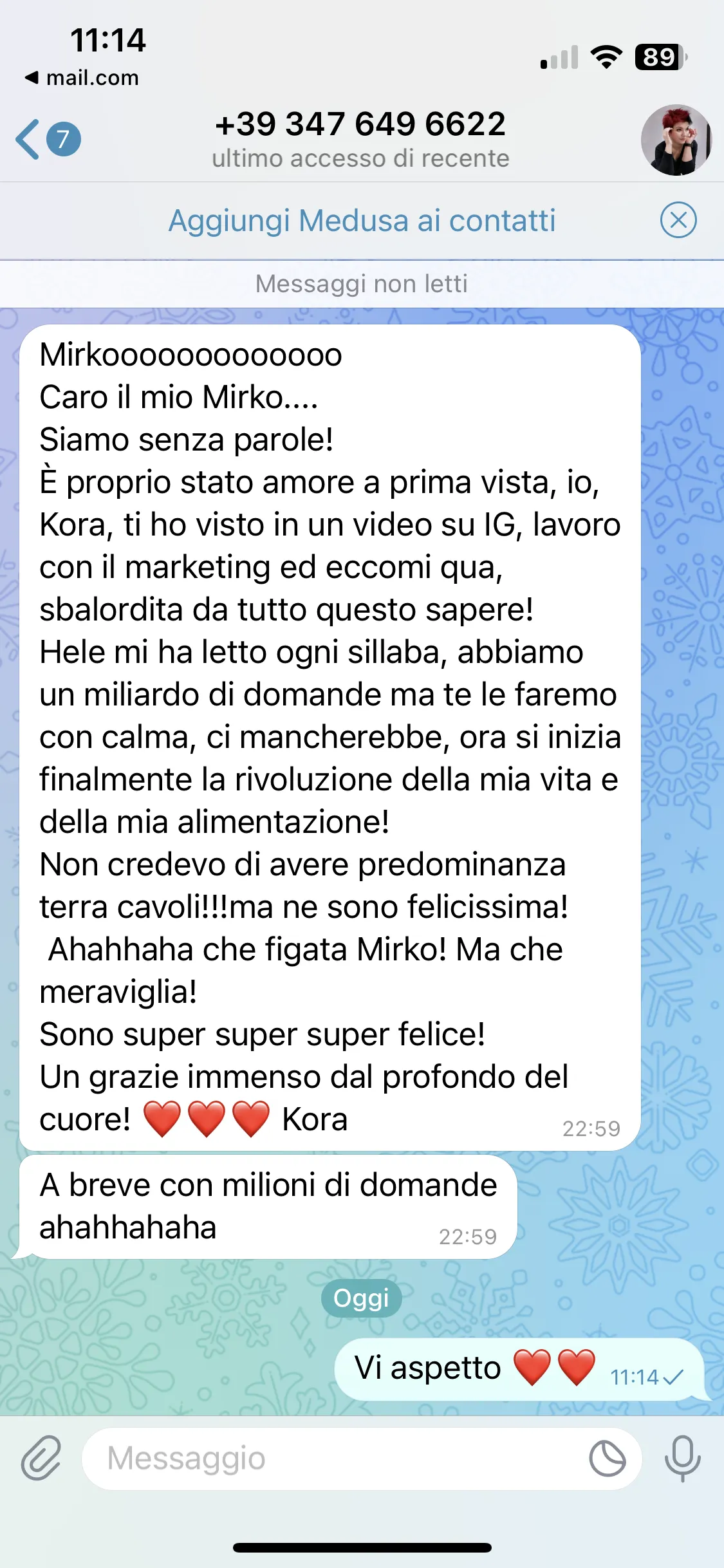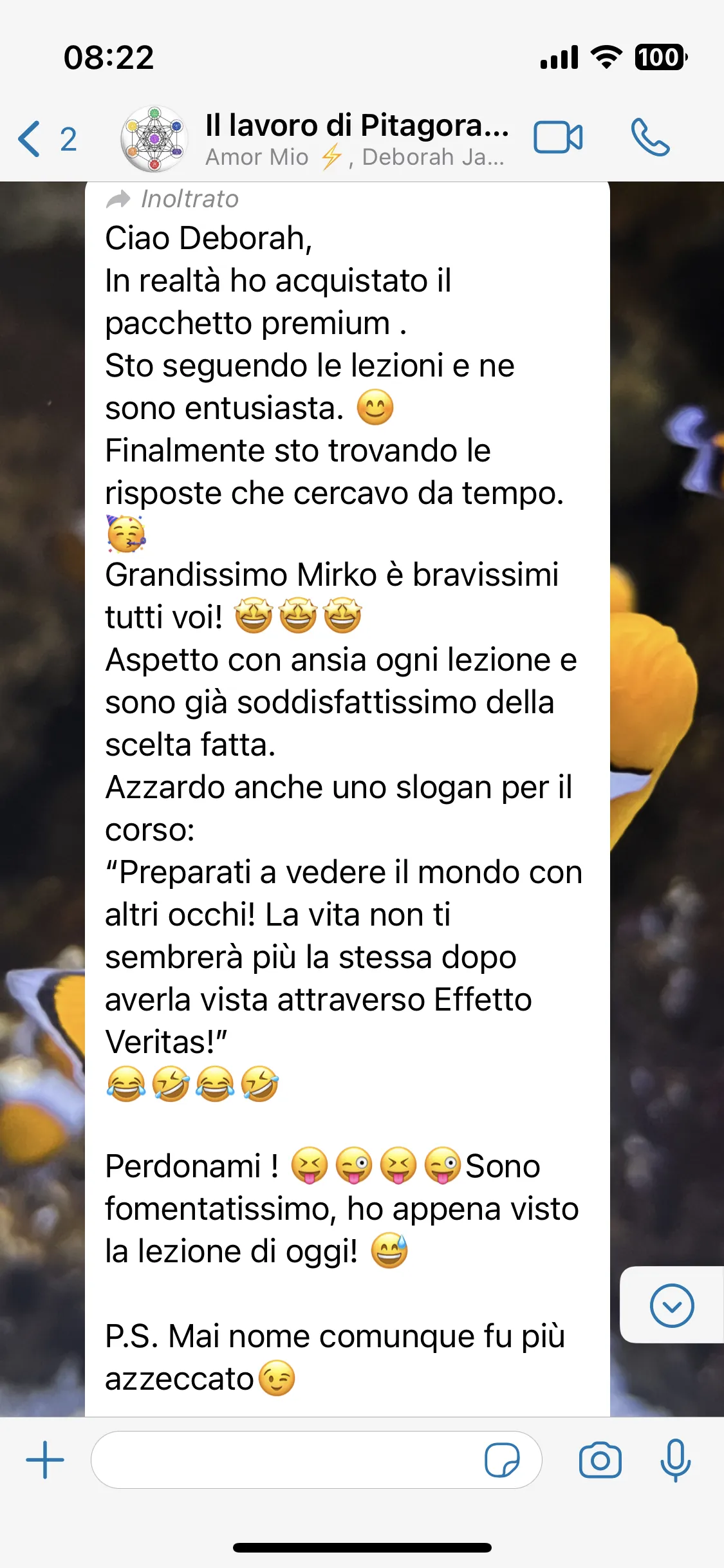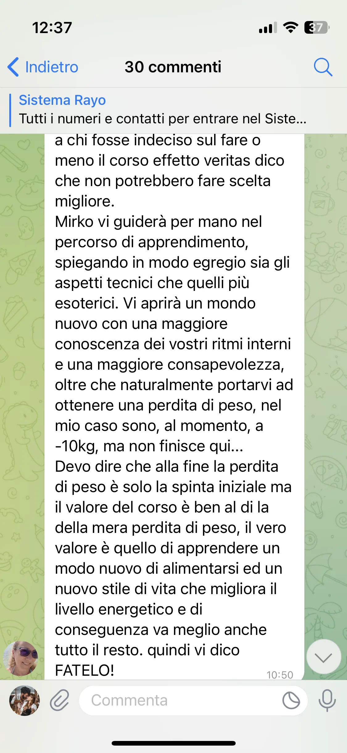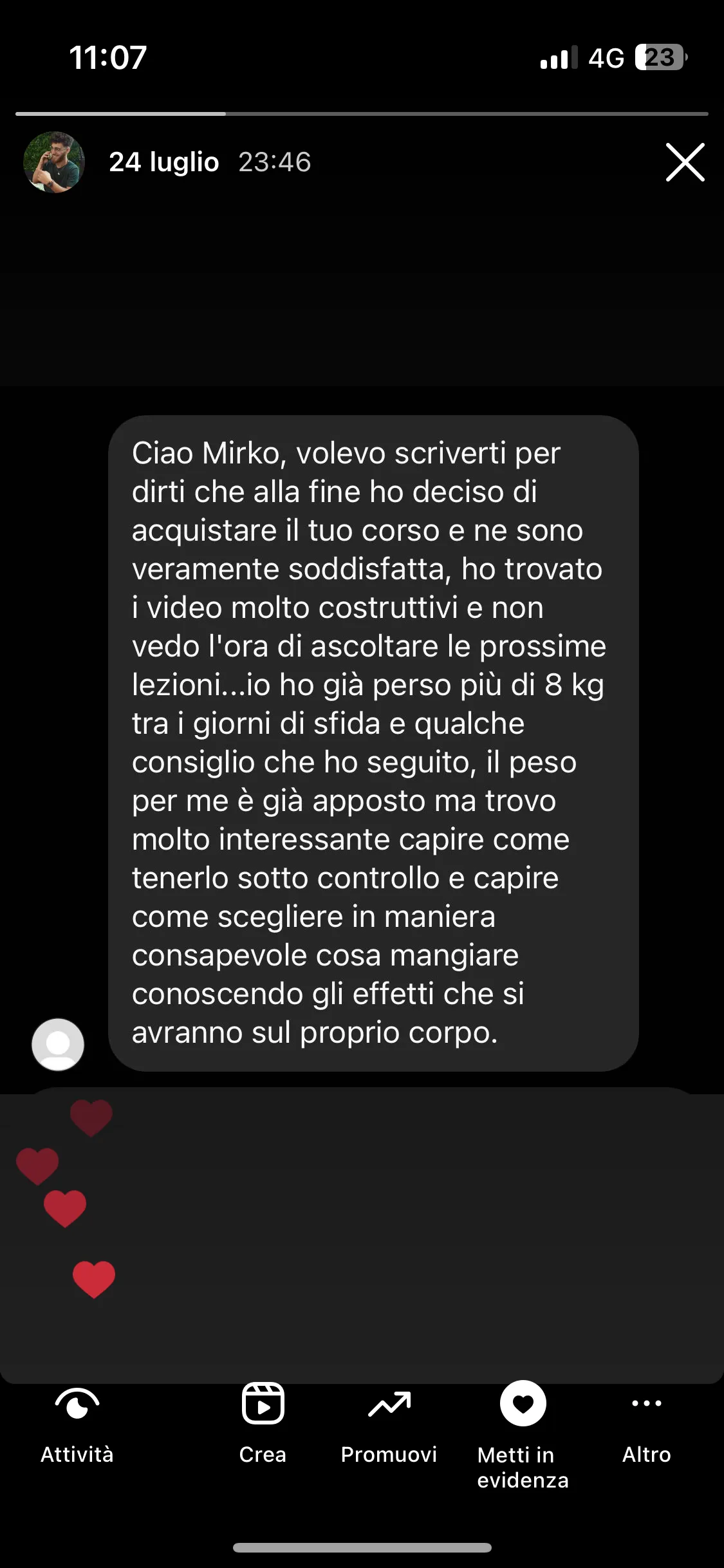 "Conosco Mirko da più di 2 anni e ho seguito i suoi corsi, ogni volta riesce a darmi qualcosa in più. Parteciperò ancora, perché ogni evento mi aiuta a vedere le cose in modo diverso. È un percorso che consiglio a tutti."